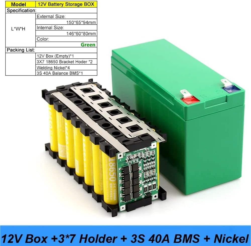 - 12V Box (Empty): One green plastic enclosure for the assembled battery pack.