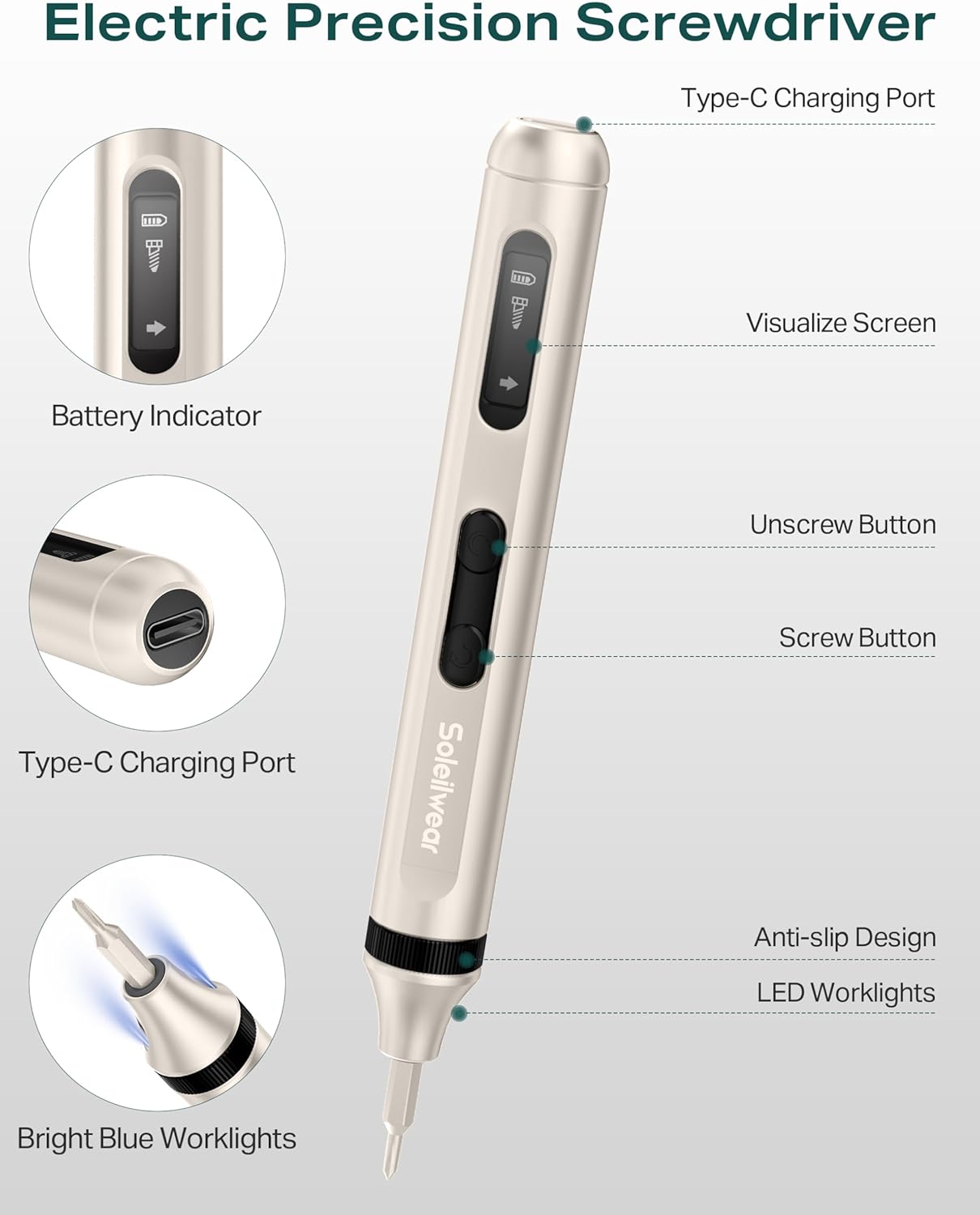 This manual provides instructions for the proper use and maintenance of your Soleilwear Mini Electric Screwdriver 52-in-1 kit. This precision tool is designed for assembling and disassembling various electronic products and small devices. Please read this manual thoroughly before operation to ensure safe and efficient use.