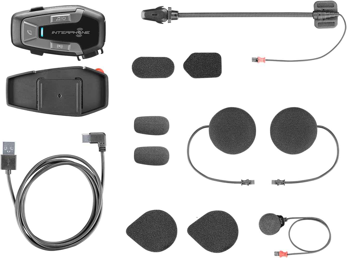 Figure 3.1: All components included in the Interphone U-Com 6R package. This image displays the main intercom unit, mounting accessories, speakers, two types of microphones (boom and wired), and the USB-C charging cable.