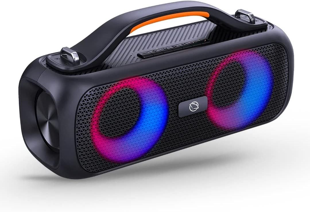 Image: The Manta SPK216 portable Bluetooth speaker, showcasing its sleek black design, integrated handle, and vibrant, circular LED lights on the speaker grilles.