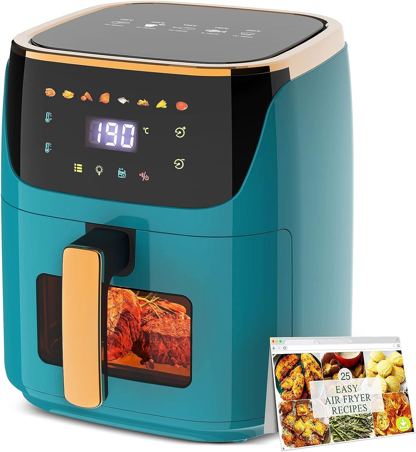 Image: The ADVWIN 8L Digital Air Fryer, showcasing its sleek design and digital display, accompanied by a recipe book to inspire healthy cooking.