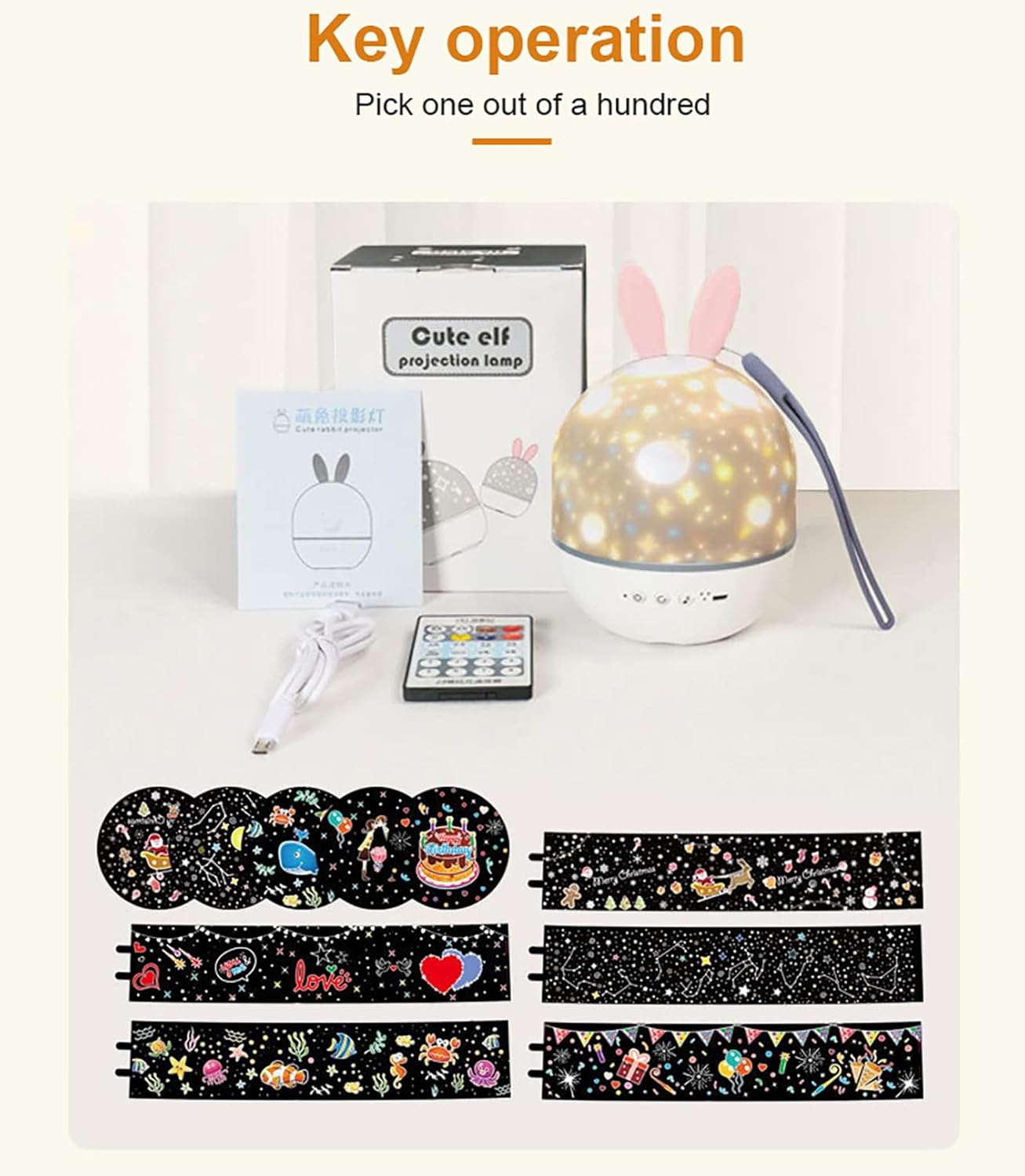 Image: The complete set of items included in the package, featuring the main lamp unit with rabbit ears, a remote control, a USB charging cable, and multiple interchangeable projection films.