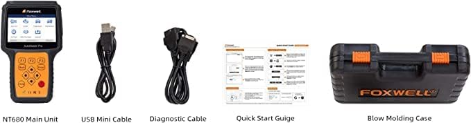 Figure 3.1: Overview of the FOXWELL NT680 package contents, including the main unit, cables, and documentation.