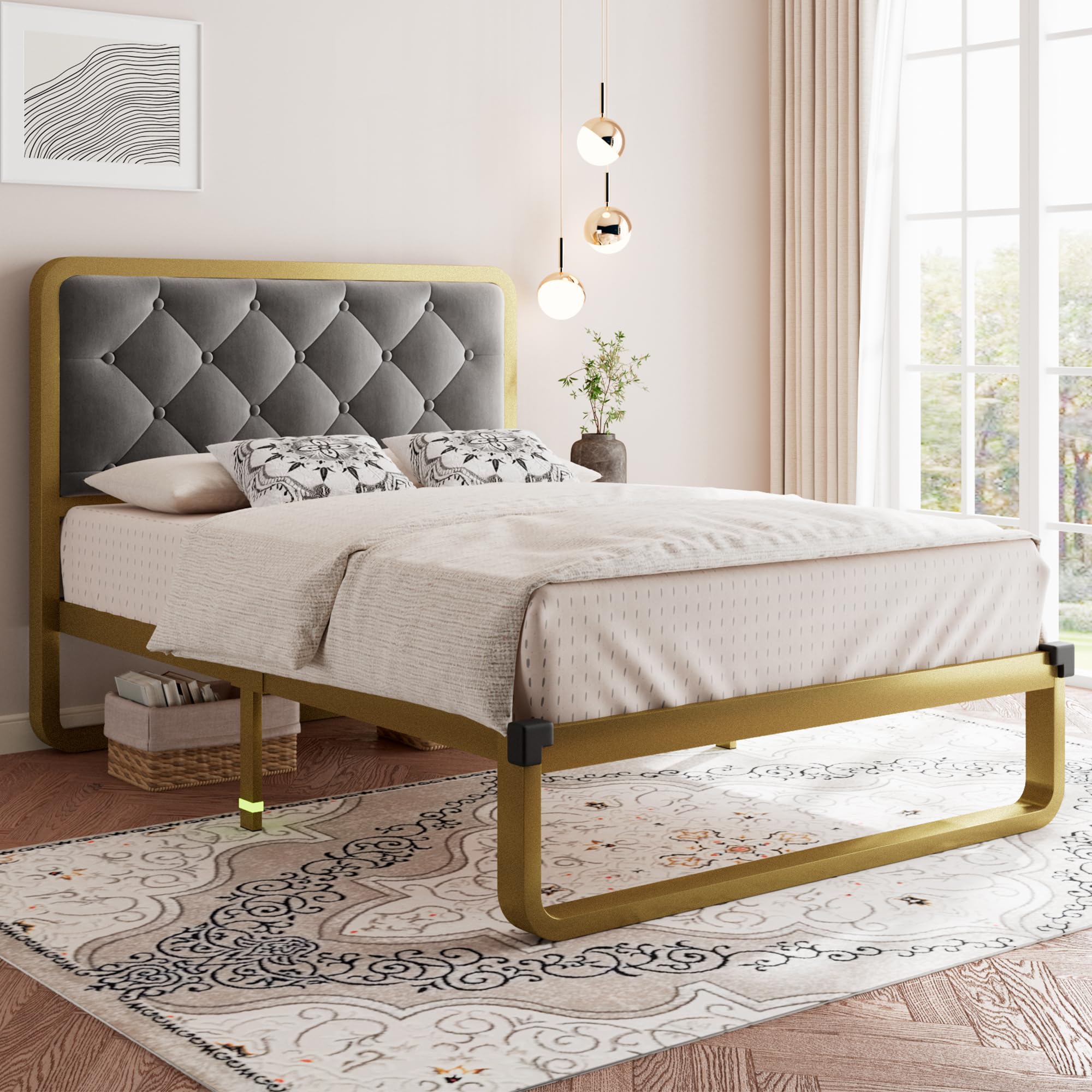 - Stylish Design: Features a velvet button-tufted headboard and a curved metal frame, providing an elegant appearance. The headboard stands 41 inches high.