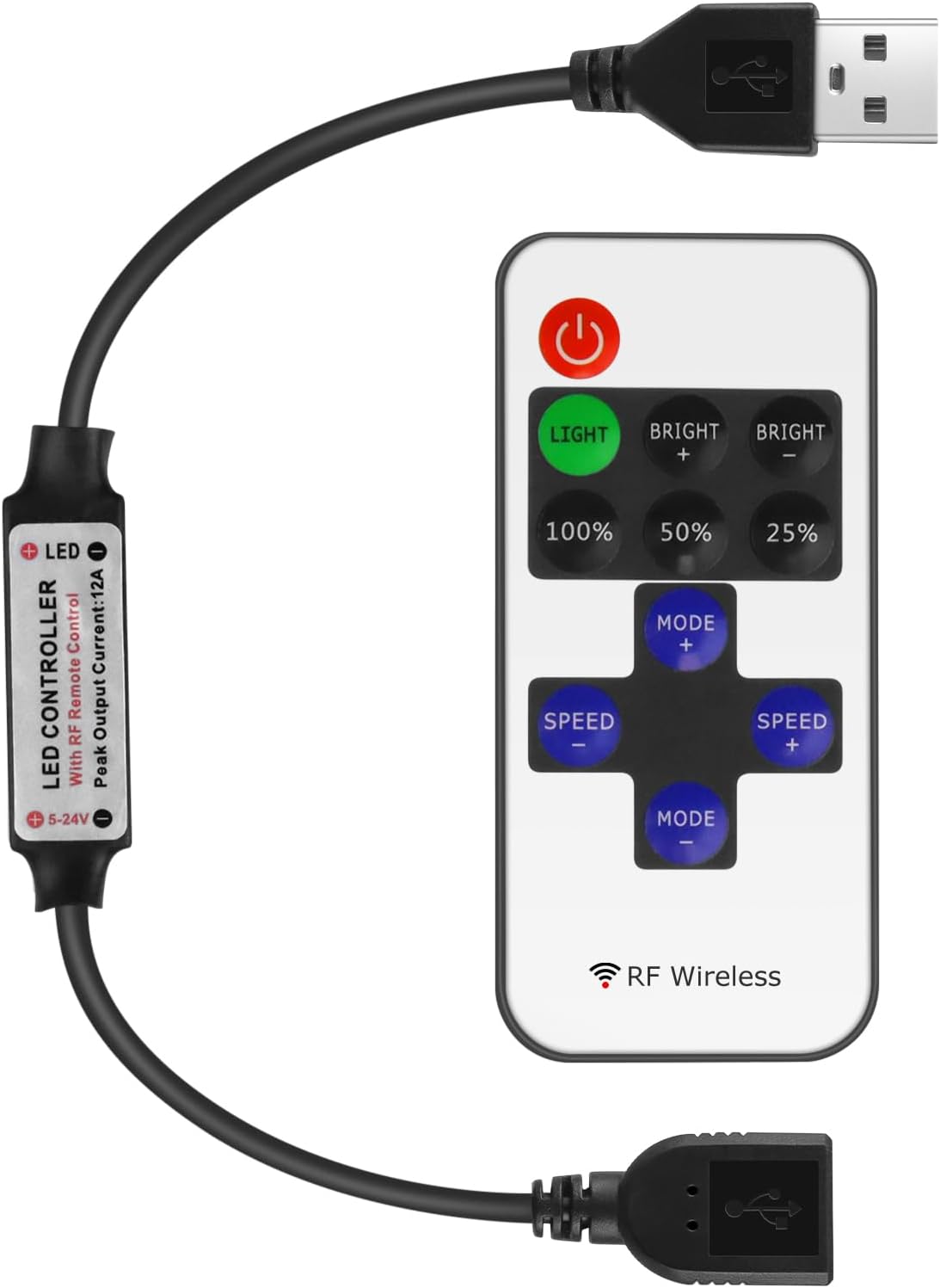 The controller module connects inline between your USB power source and the single color LED strip. The remote control uses Radio Frequency (RF) technology, allowing operation without direct line-of-sight to the controller module.