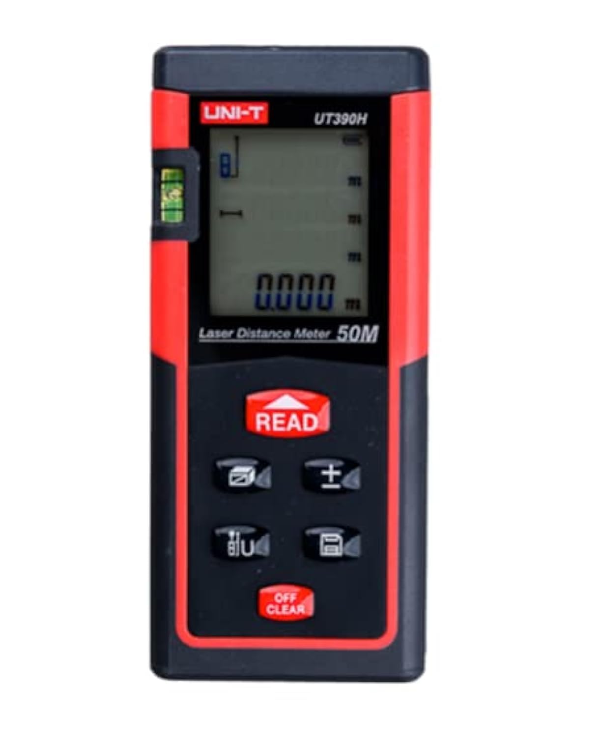 Figure 1: Front view of the UNI-T UT390H Laser Distance Meter, showing the display, control buttons, and laser aperture. The device is red and black with a digital screen.
