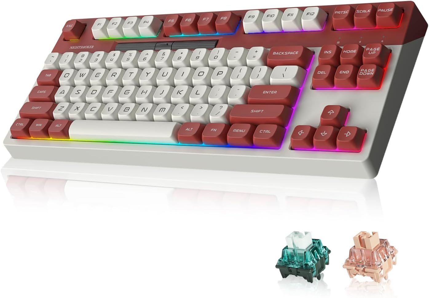 The DUKHARO NightSmoker is an 87-key tenkeyless mechanical keyboard featuring a gasket-mounted design for enhanced typing feel and sound. It supports multiple connectivity options and customizable RGB lighting.