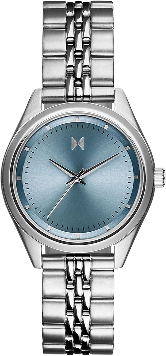 Image 1.1: Front view of the MVMT Rise Mini Watch, showcasing its aqua blue dial and silver-tone bracelet.