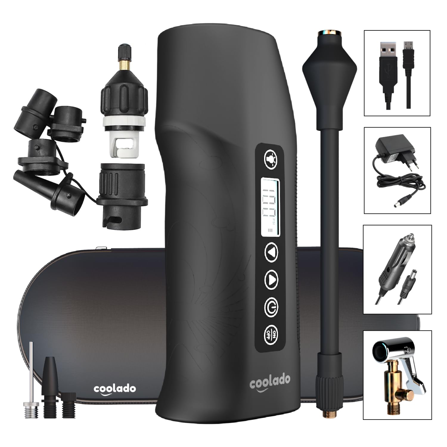 The Coolado tPump XL + SUP Adapter is a versatile and powerful portable air pump designed for a wide range of inflation needs. This device features a patented 2-cylinder compressor, an 8000 mAh battery, and comes with various adapters, making it suitable for bicycle tires, car tires, kites, wingfoils, inflatable tents, SUPs, kayaks, and more. This manual provides detailed instructions on how to safely and effectively use, maintain, and troubleshoot your Coolado tPump XL + SUP Adapter.