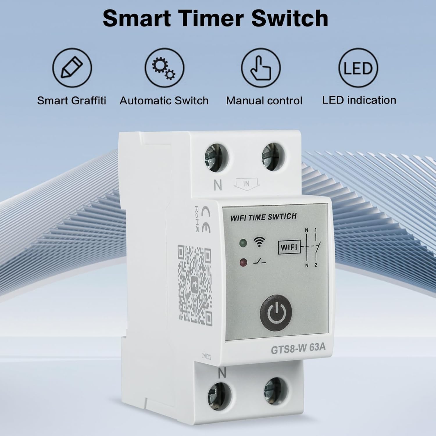 The Jadeshay GTS8-W WiFi Smart Timer Switch is designed to provide intelligent control over electrical loads in your home or office. This device allows you to remotely manage and schedule the on/off status of connected appliances via a mobile application, offering convenience and energy efficiency. It is compatible with a 35mm DIN rail for easy integration into existing electrical panels.