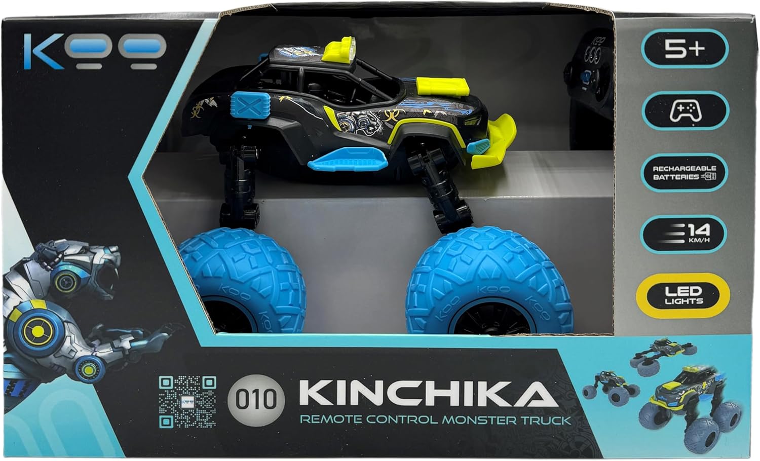 Image: KOO Kinchika product packaging. The box displays the car in its monster truck configuration, the remote control, and key features like "5+", "Rechargeable Batteries", "14 KM/H", and "LED Lights".