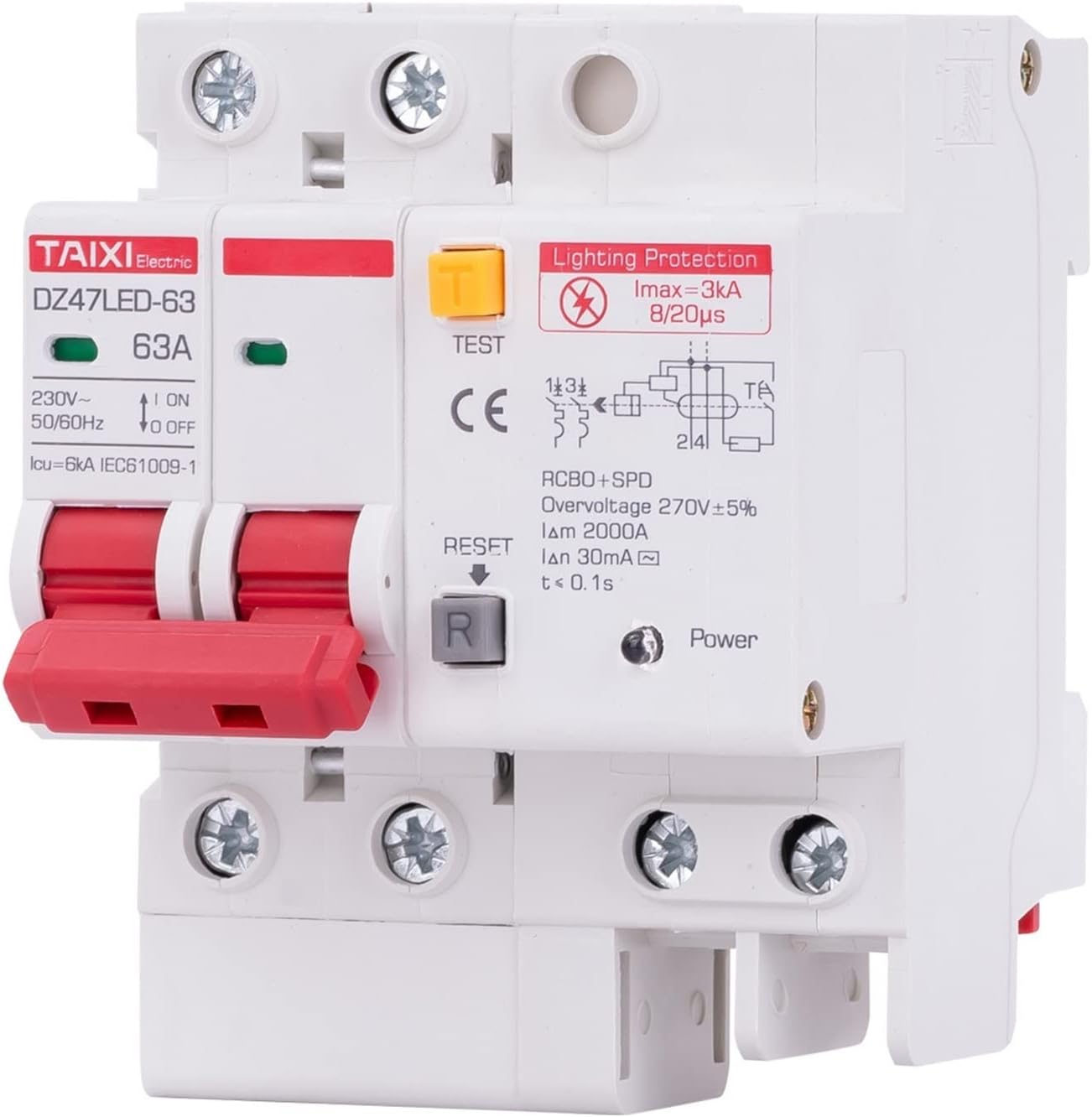 The DZ47LED-63 is a 2-pole device that combines the functions of a Residual Current Circuit Breaker with Overcurrent Protection (RCBO) and a Surge Protective Device (SPD). It is designed to protect against overloads, short circuits, earth leakage faults, and transient overvoltages caused by lightning or switching operations.
