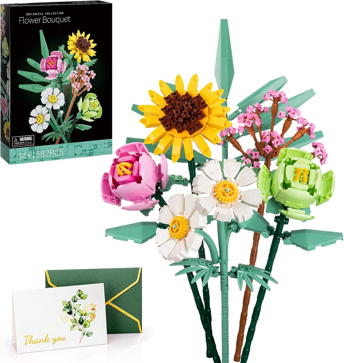 Image 1.1: The IKUPER Botanical Collection Flower Building Set, showing the product box and the fully assembled bouquet.