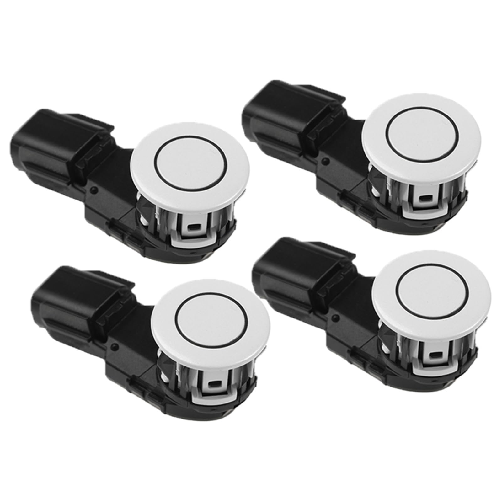 This image displays four Toiumops PDC Parking Sensors, model 89341-02040, in a set. The main part of the sensor is white and circular, with a black housing and connector. A smaller inset image shows a detailed view of the electrical connector pins.