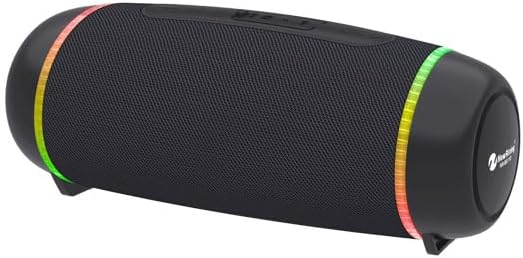 Figure 1: Front view of the NewRixing Outdoor Portable Bluetooth Speaker. The speaker is black with a textured grille, featuring colorful LED light rings on both ends. It has a cylindrical shape with small feet for stability.