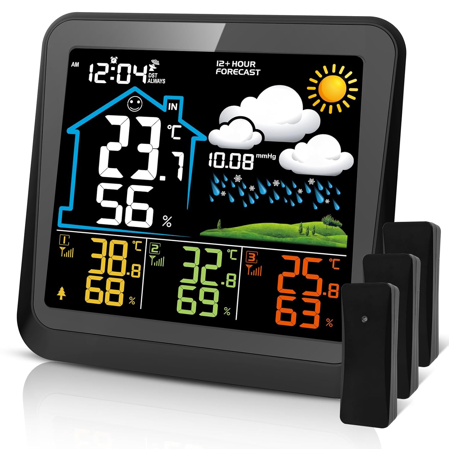 The HAOYAO Wireless Weather Station is designed to provide comprehensive weather information for your home or office. It features a large color LCD touchscreen display and comes with three wireless outdoor sensors, allowing you to monitor temperature and humidity in multiple locations.