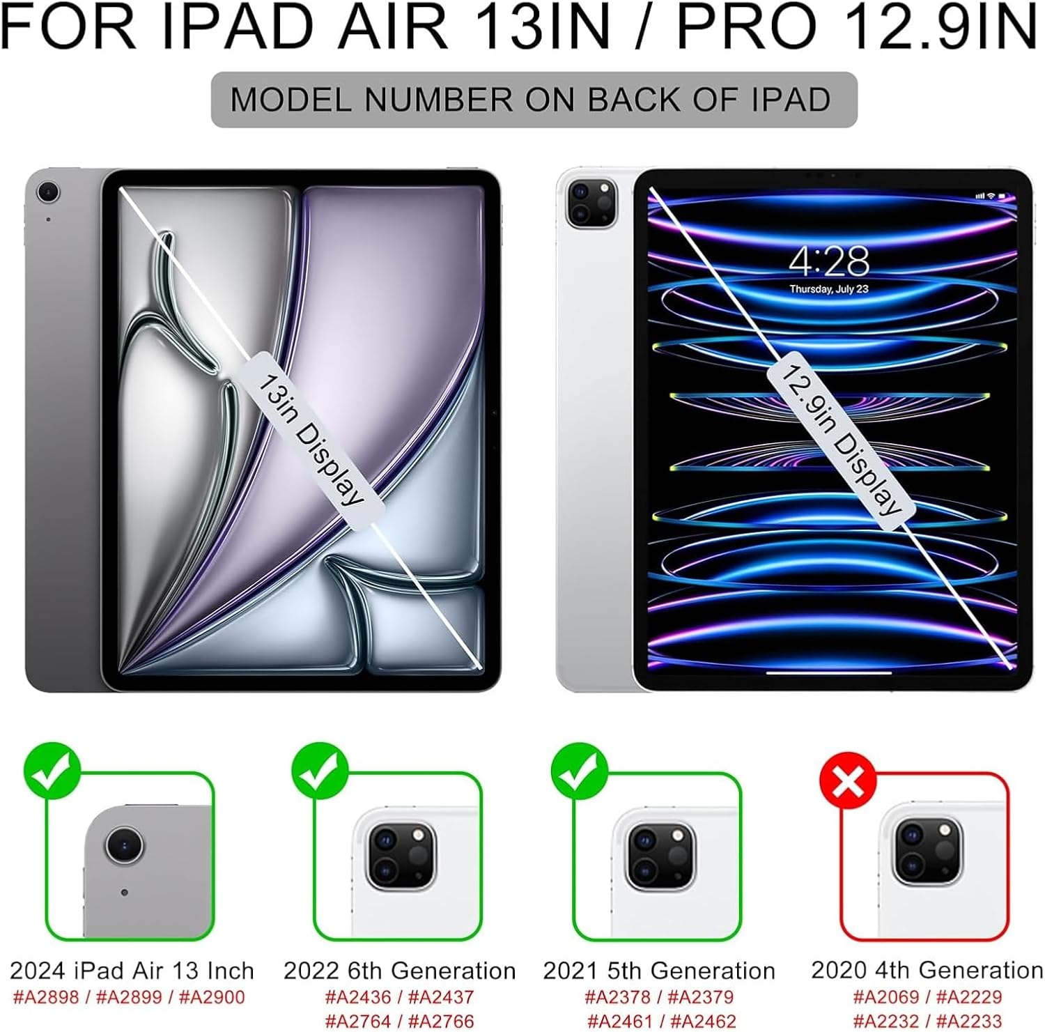 Figure 2.1: Compatibility chart illustrating the specific iPad Air 13-inch and iPad Pro 12.9-inch models supported by this keyboard case, along with visual cues for model identification.