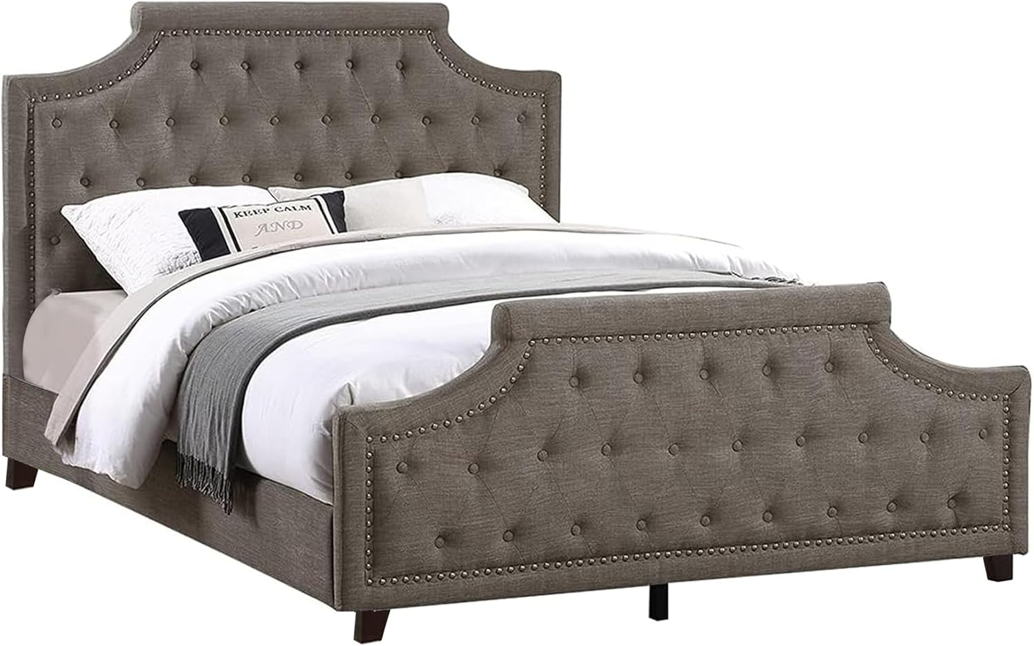 Image: The Benjara Gia Upholstered King Size Bed, featuring a tufted headboard and footboard with nailhead trim, upholstered in a rich brown polyester fabric.
