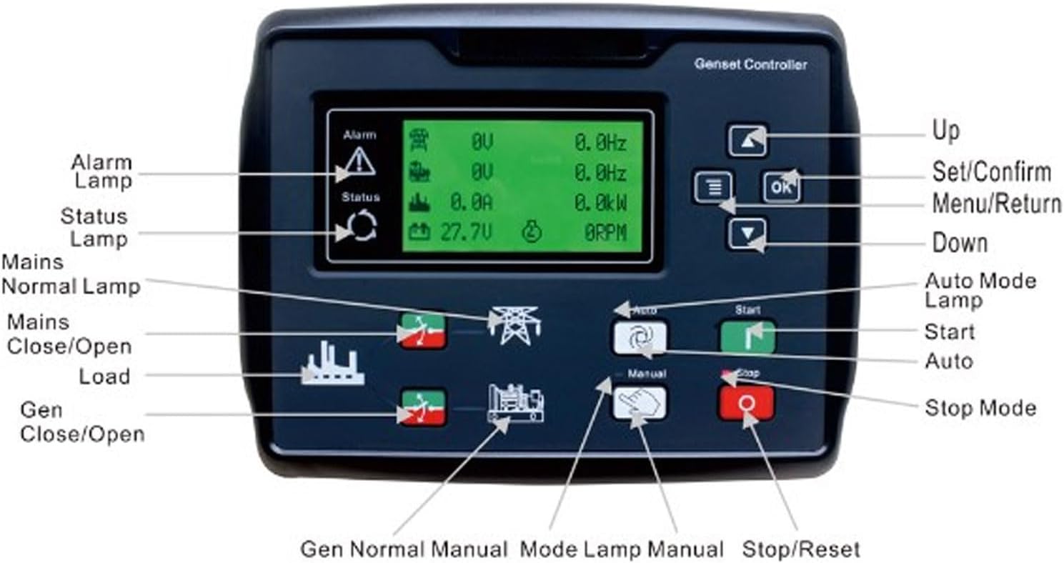 | Controller displays an alarm. | Specific fault condition (e.g., over-voltage, under-frequency, low oil pressure). | Note the alarm code/message on the display. Refer to the controller's detailed alarm list (if available) for specific troubleshooting steps. Address the underlying fault. |