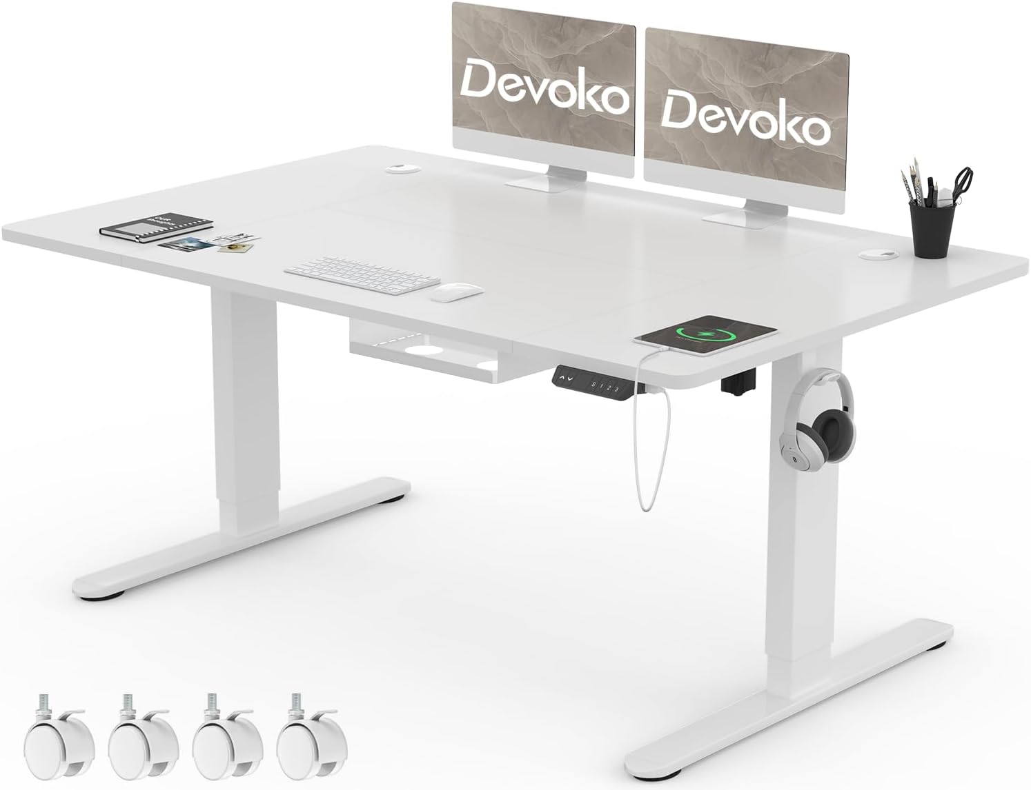 Image: The Devoko Electric Lift Desk, showcasing its spacious white tabletop, sturdy legs, integrated control panel, and convenient USB-A charging port. The image also highlights the included casters for mobility.