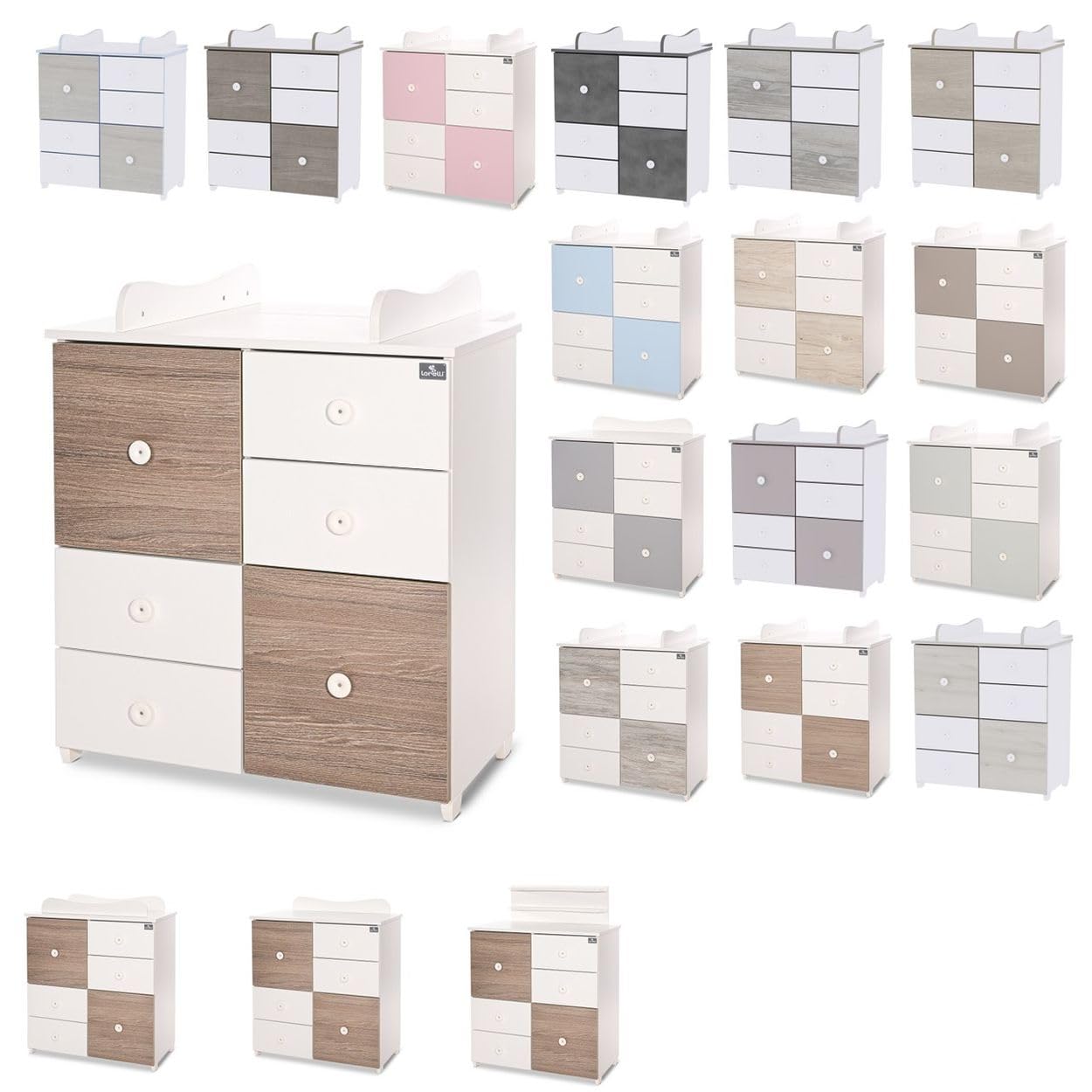 Thank you for choosing the Lorelli Commode Cupboard. This versatile furniture piece is designed to provide practical storage and functionality for your child's room. It features four drawers and two doors with internal shelves, offering ample space for clothes, toys, and other accessories. The commode can be configured in multiple ways, serving as a changing table or a standard dresser with additional shelving options.