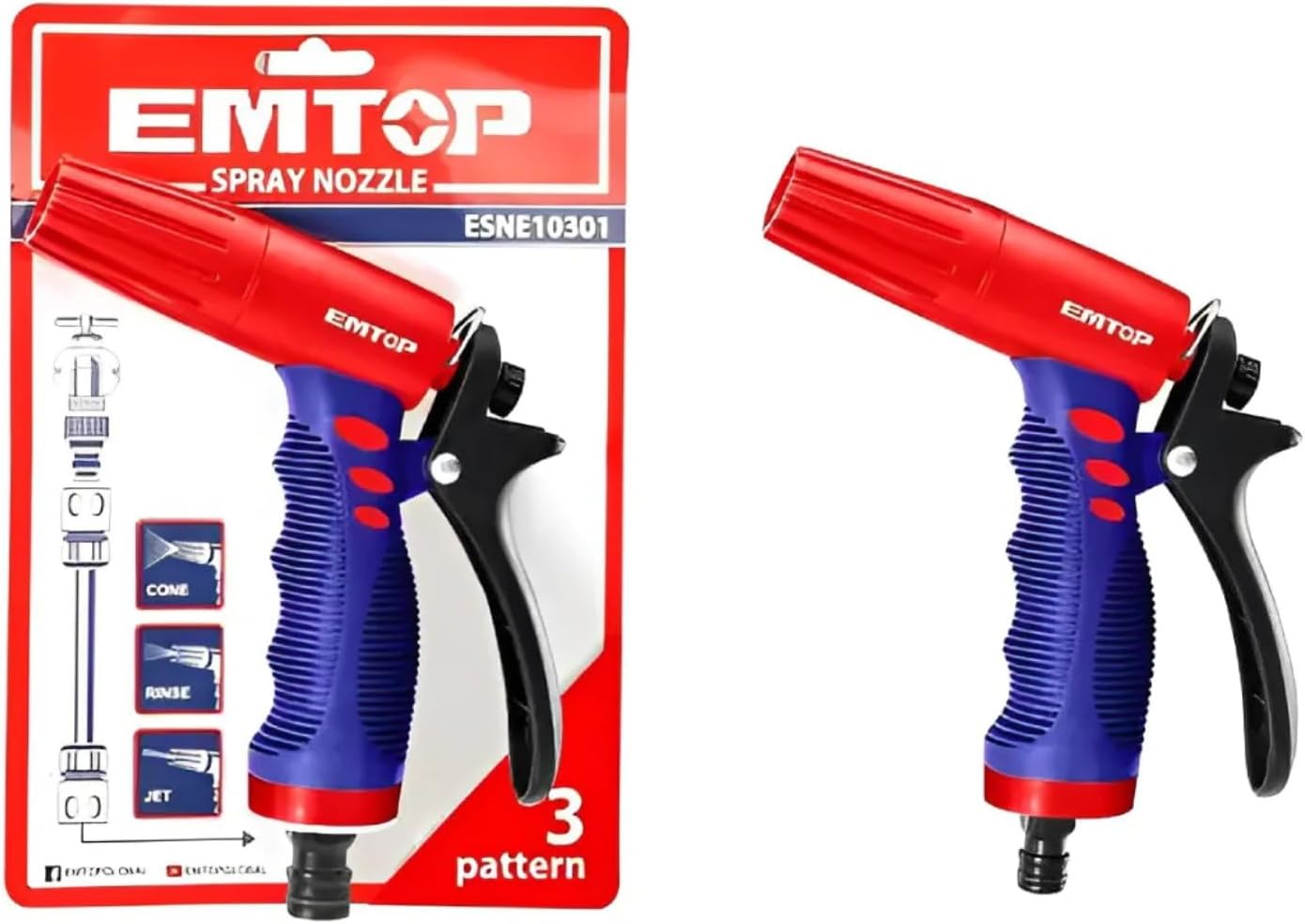 The EMTOP ESNE10301 is designed for various watering and cleaning tasks, featuring a durable plastic construction, a comfortable grip, and three distinct spray patterns for versatile application.