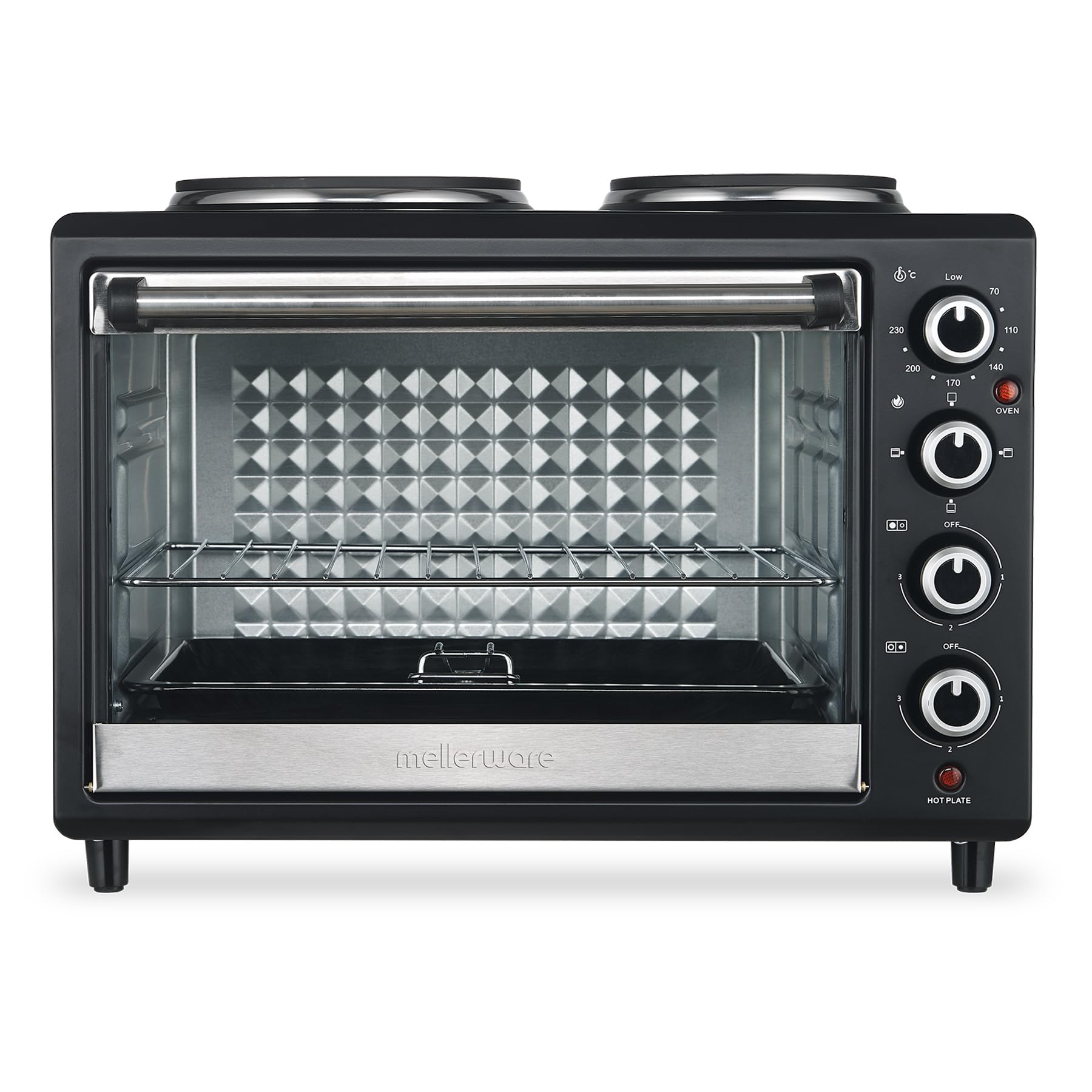 The Mellerware Horizon 30 Mini Oven features a 30-liter oven capacity and two solid hot plates. It includes various controls for temperature, cooking functions, and hot plate power levels.