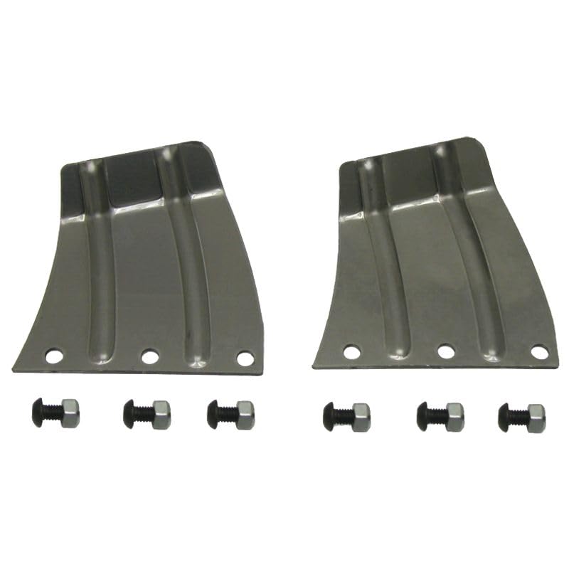 This image displays two identical ISE replacement blades, designed as uplift wings. Each blade is made of metal, featuring a curved shape with raised ridges for improved airflow and cutting efficiency. Below each blade are three sets of bolts and nuts, indicating the necessary hardware for installation.