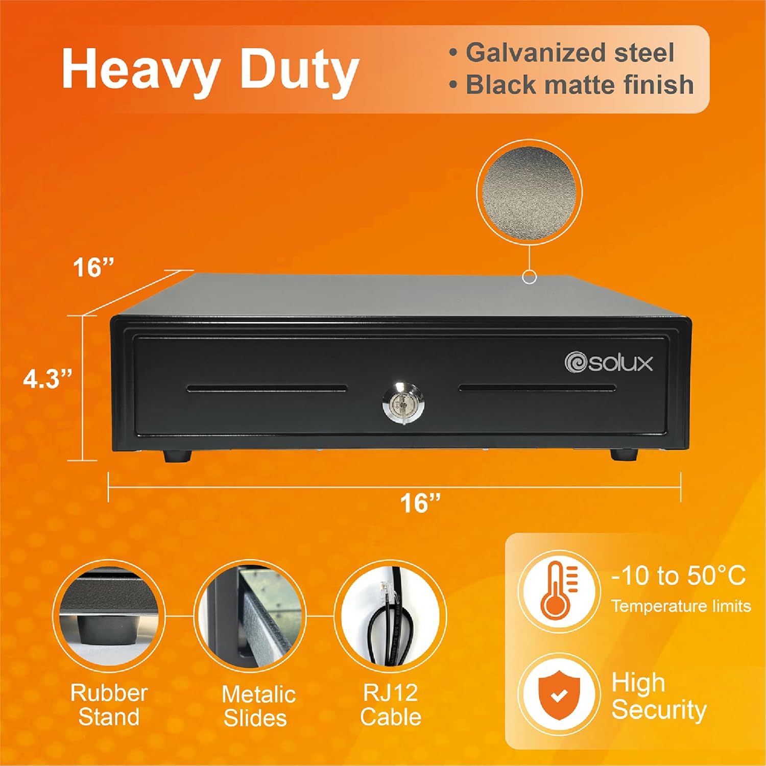 Thank you for choosing the SOLUX 16 Inch Cash Drawer. This manual provides essential information for the proper setup, operation, and maintenance of your cash drawer. This durable cash drawer is designed for efficient cash management in various retail environments, offering secure storage and seamless integration with compatible Point of Sale (POS) systems.