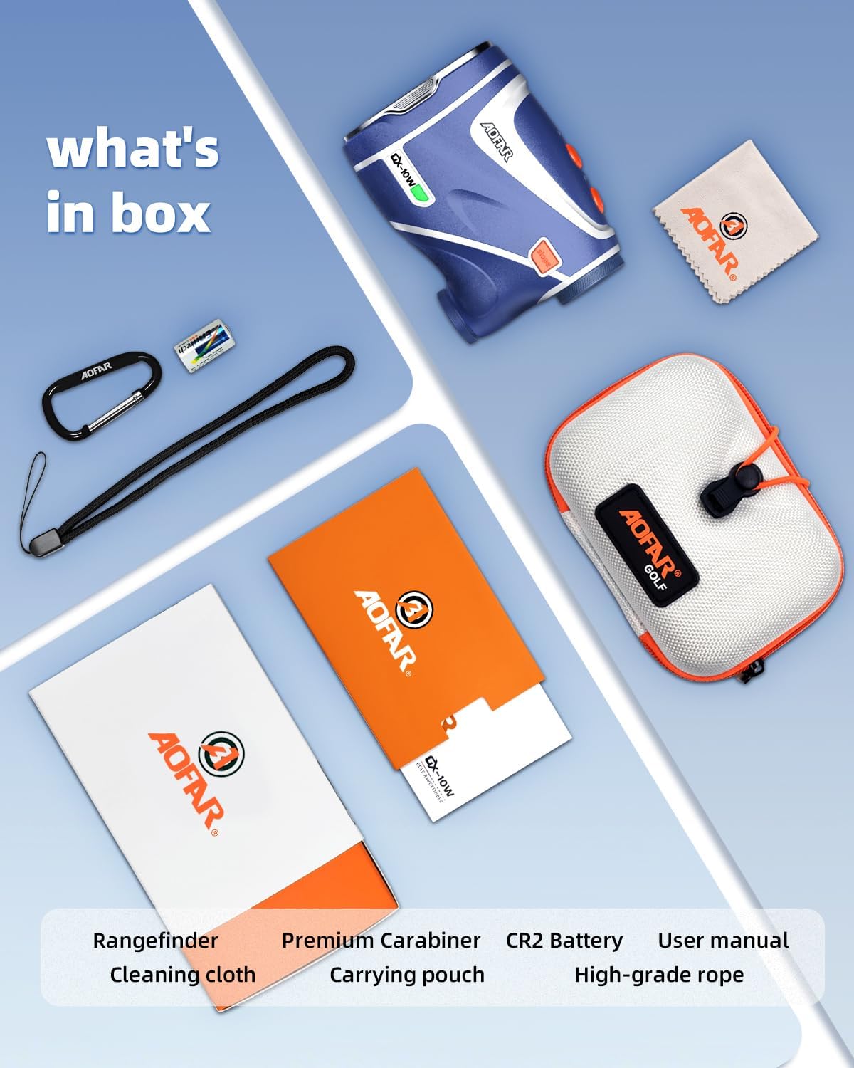 Image: All components included in the AOFAR GX-10W Golf Rangefinder package.