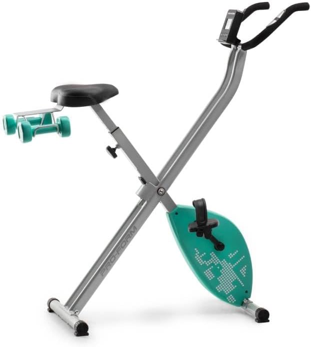 Figure 1: The ProForm X Bike shown in its compact, folded configuration, highlighting its space-saving design.