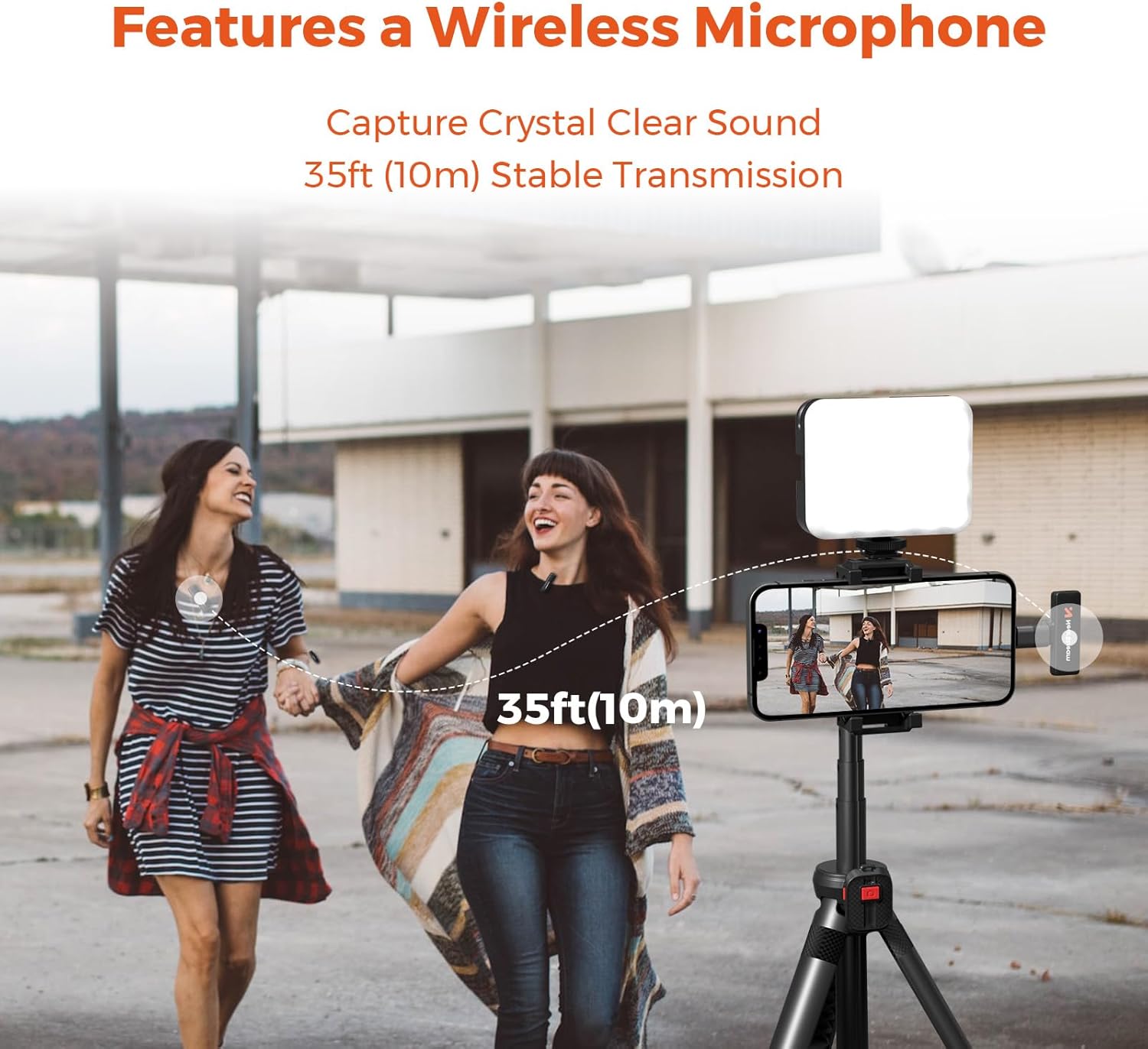 Image: Two individuals, one wearing the wireless microphone, demonstrating clear sound capture from a distance of 35 feet (10m).