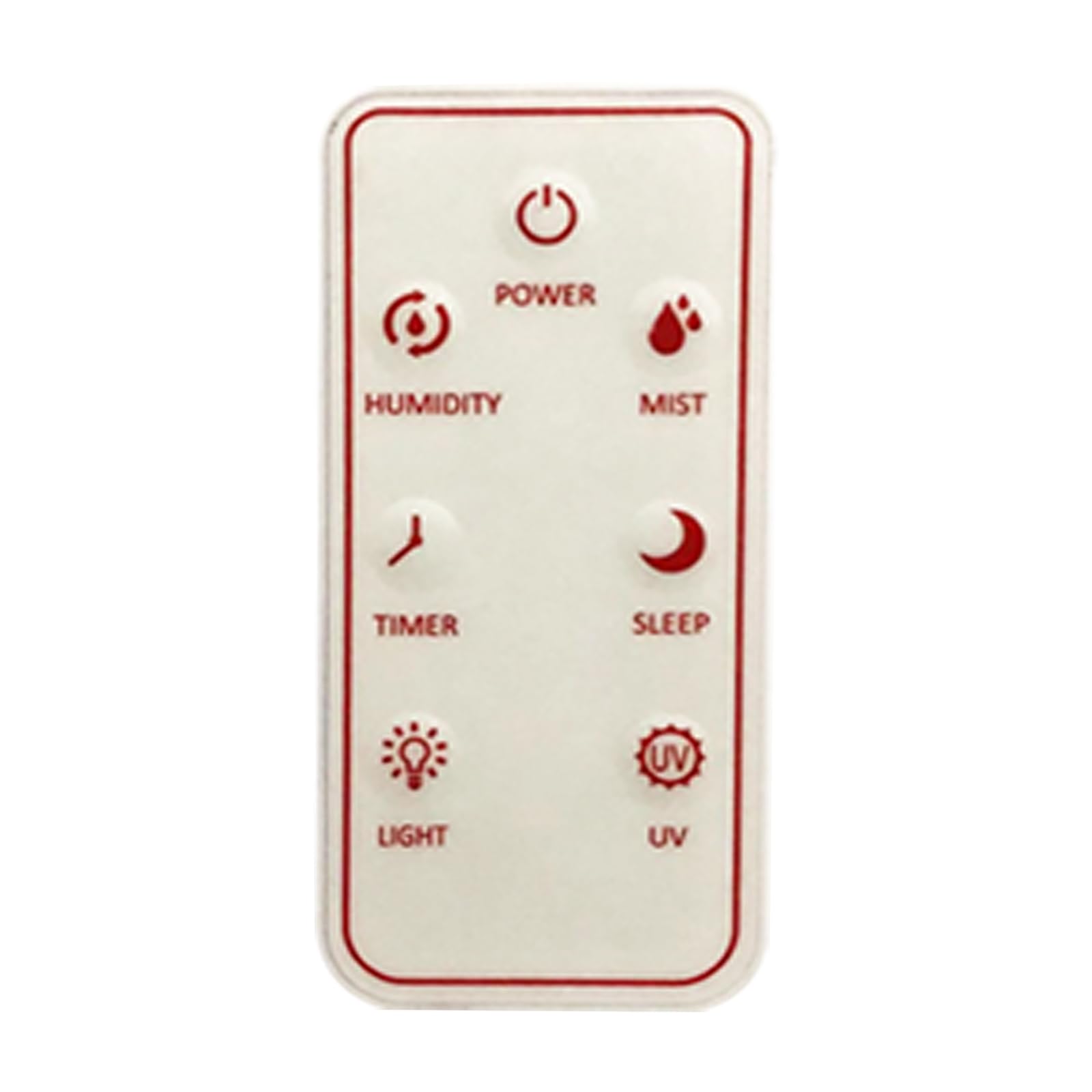The Tebild H2008 remote control is a compact, white, rectangular device designed for ease of use. It features clearly labeled buttons for controlling various functions of a compatible humidifier.