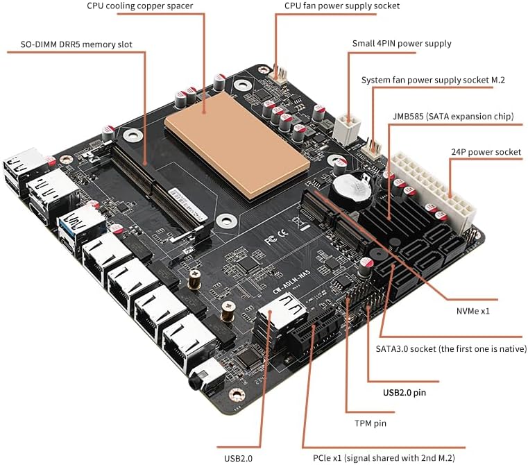 - 4 Intel i226-V 2.5G network card chips; 1 SO-DIMM DDR5 4800 memory slot compatible with 5200/5600MHz.