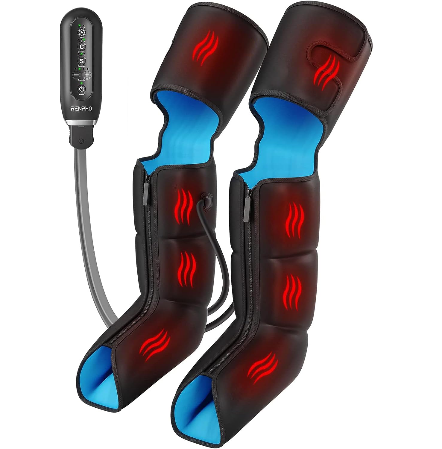 Figure 1: RENPHO Leg Massager with Heat components. This image displays the leg wraps designed for both calves and thighs, highlighting their adjustable nature and integrated control panel.