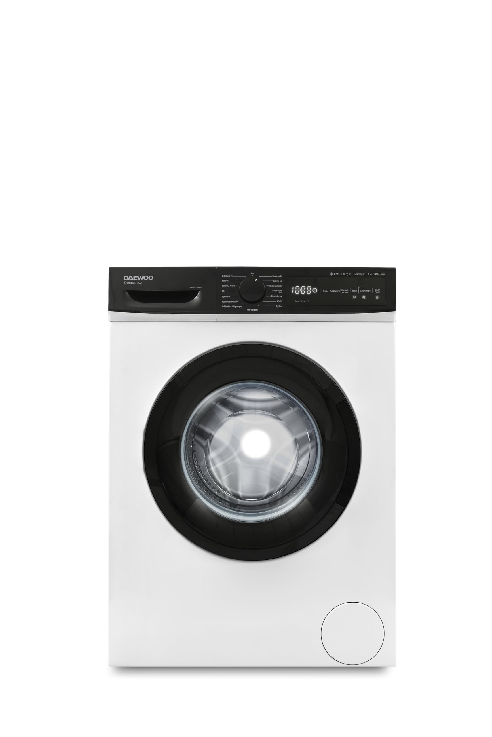 Figure 2.1: Front view of the Daewoo WM814TTWA1DE washing machine, showing the control panel, detergent drawer, and drum door.