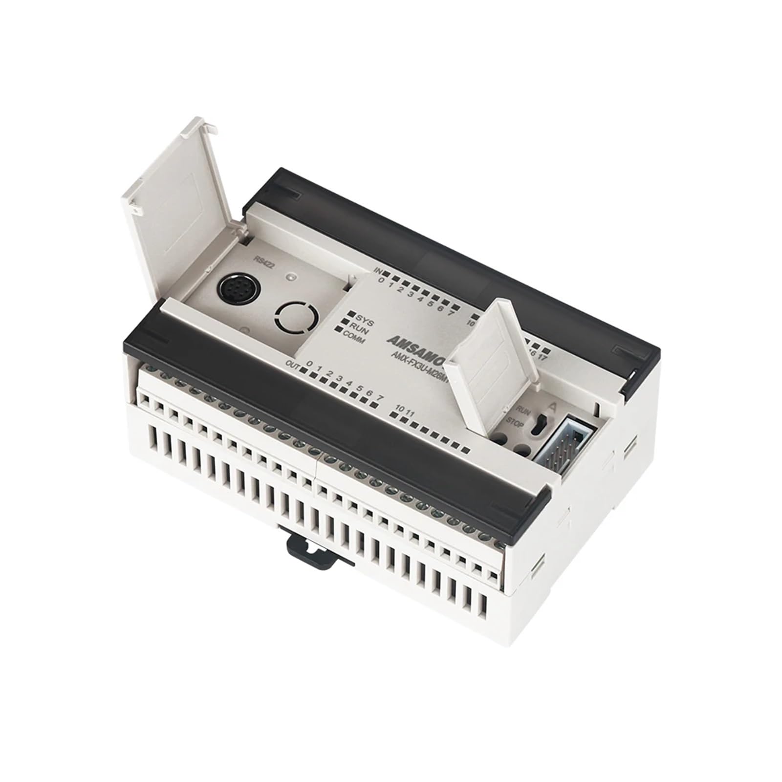 Figure 3: Angled view of the JOCCOS FX3U-24MR PLC, illustrating the accessible terminal blocks for wiring. This perspective helps in identifying the connection points for power, digital inputs, digital outputs, analog signals, and communication interfaces.