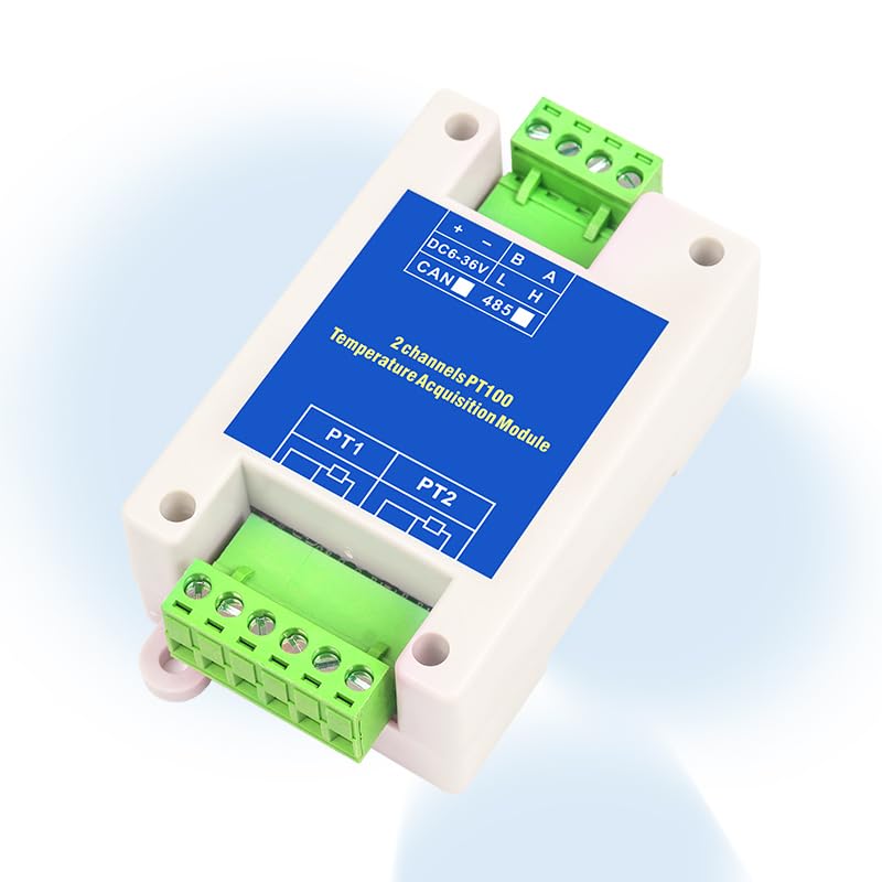 The KWL-01-2PT module features two independent channels for PT100 sensor input, providing isolated RS485 Modbus output for reliable data acquisition. It operates on a 6-36V DC power supply and offers high temperature accuracy.