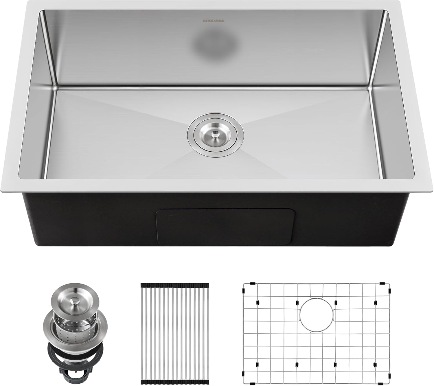Image: The SINKVINE 33-inch Undermount Kitchen Sink, showcasing its single bowl design and the included drain strainer, bottom grid, and roll-up drying rack.