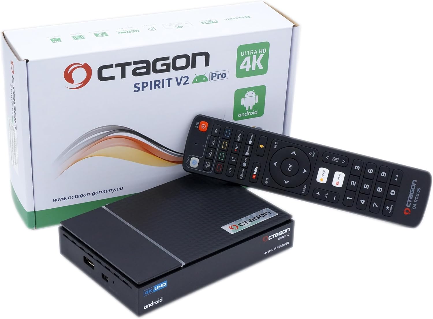 Image: Contents of the Octagon Spirit PRO package, including the TV box, remote, cables, and power adapter.