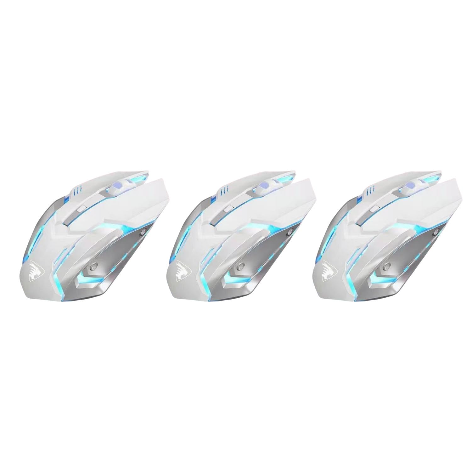 Image: Three Eweadn G305 wireless gaming mice in Moonlight White, showcasing the product's design and color.