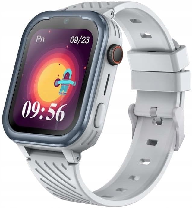 Image: Front view of the Garett ESSA 4G Kids Smartwatch in grey, displaying the time and a colorful background.