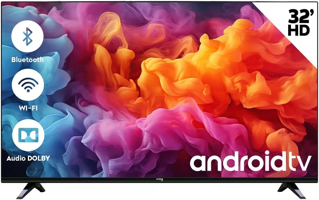 Image: Front view of the CUORY 32-inch Smart TV, highlighting its key features like Bluetooth, Wi-Fi, and Dolby Audio support, along with the Android TV logo.