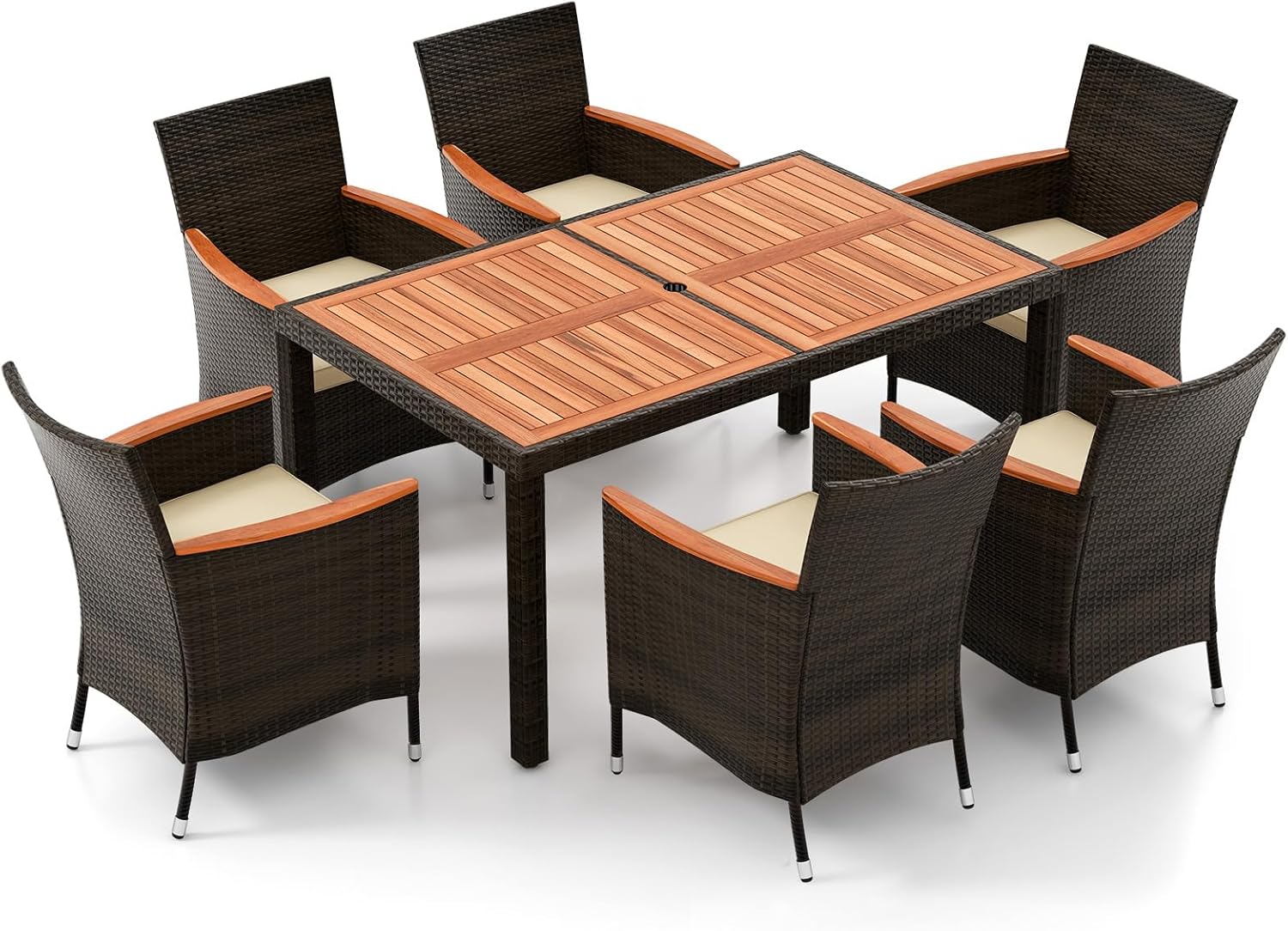 Image: The complete DORTALA 7-Piece Patio Dining Set, showcasing the acacia wood table and six brown poly rattan chairs with light-colored cushions.