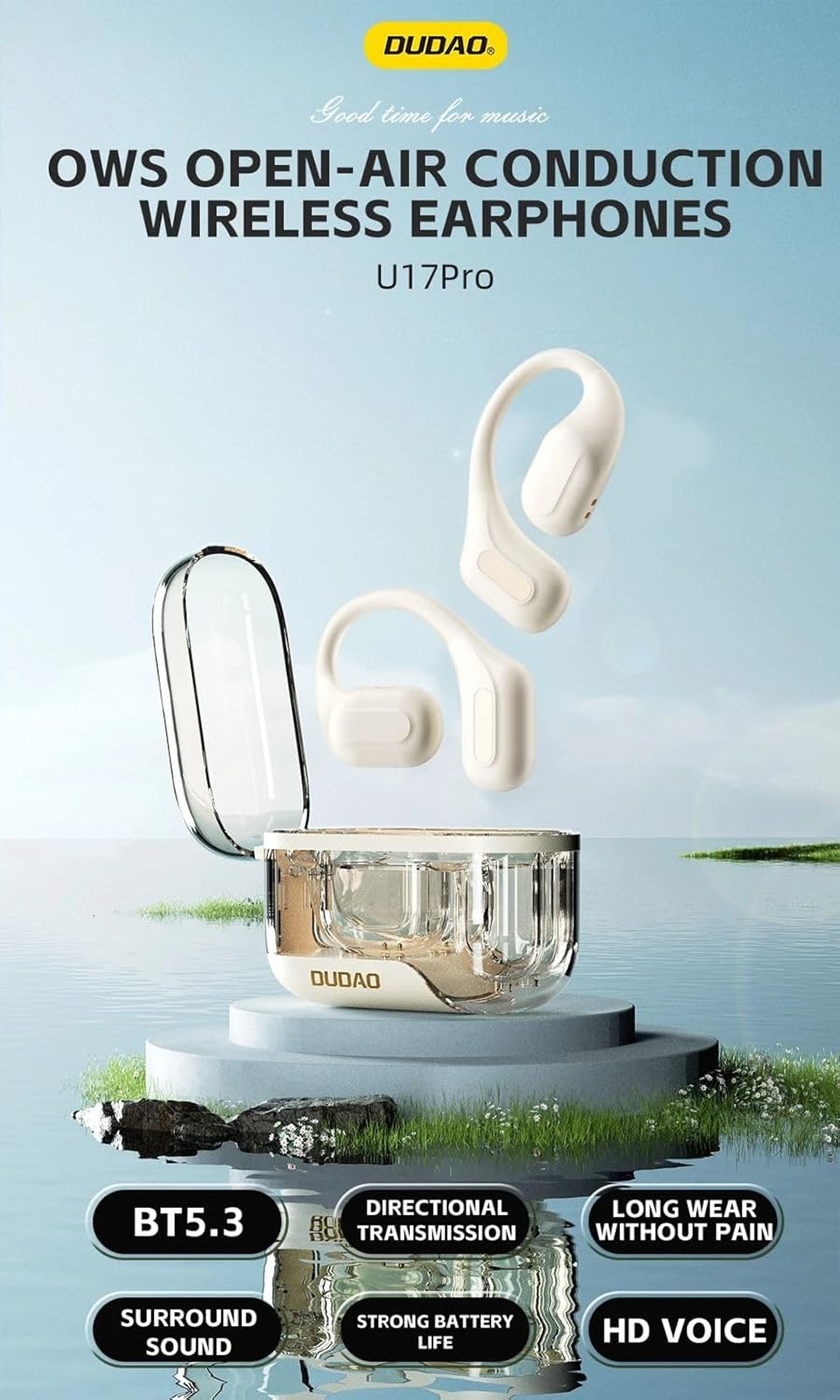 Image: Overview of DUDAO U17PRO Open Ear Wireless Earphones, highlighting features such as Bluetooth 5.3, surround sound, long wear comfort, and strong battery life.
