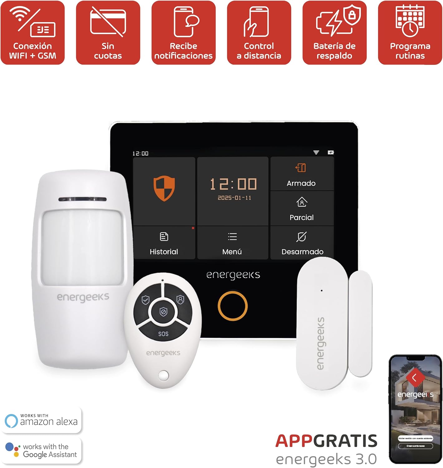 The system is compatible with Google Home and Amazon Alexa, simplifying the management of your home security through voice commands. Link your Energeeks account with your preferred voice assistant to arm, disarm, or check the status of your alarm system hands-free.