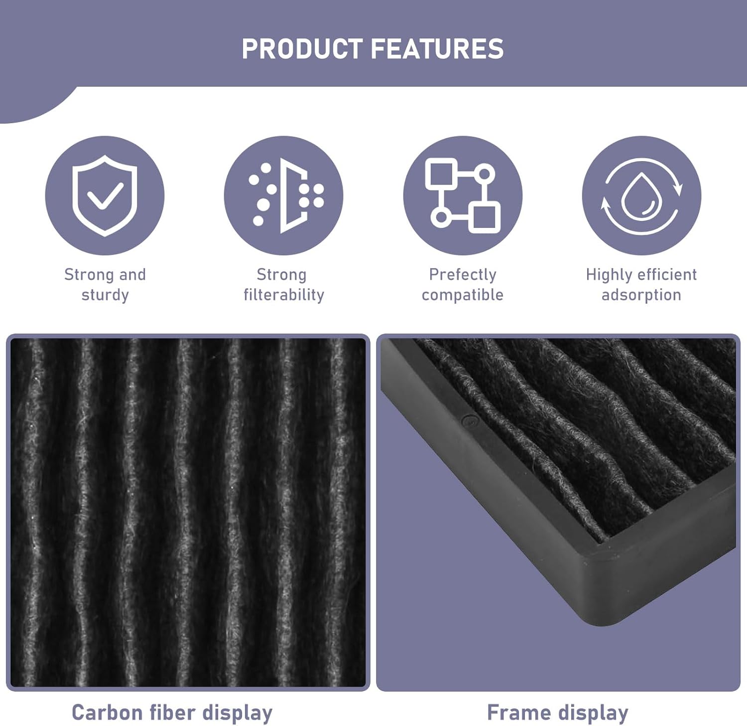 Image 1: Product Features Overview. This image illustrates the key characteristics of the charcoal filter, including its robust construction, effective filtration capabilities, compatibility, and high adsorption efficiency for odors.