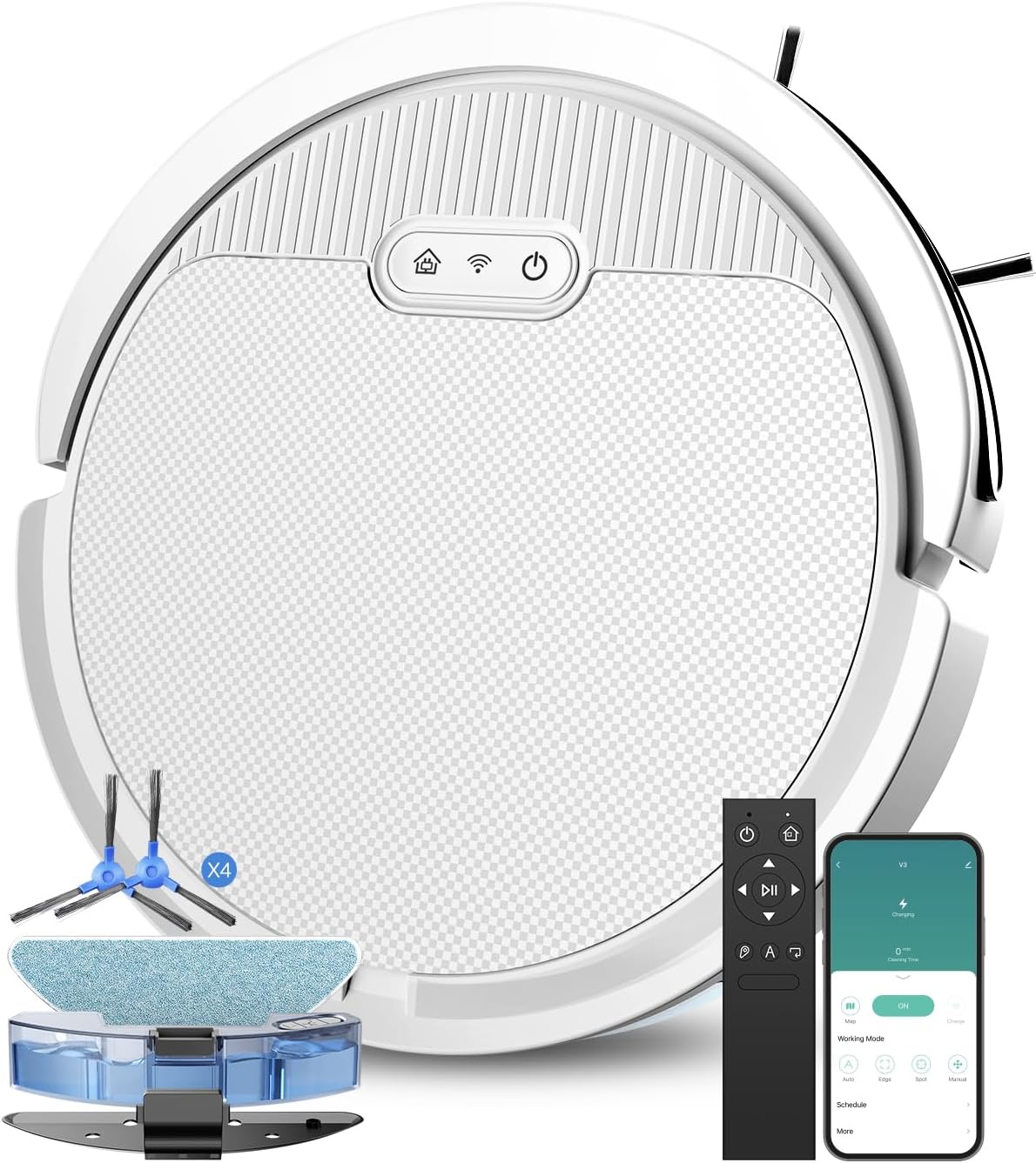 Intelligent APP, Voice, and Remote Control: Control the robot's cleaning direction, switch modes, adjust suction power, and set schedules easily via the dedicated app. It is compatible with Alexa, Siri, and Google Home for convenient voice control. A remote control is also included for direct operation. (Supports 2.4Ghz Wi-Fi only)