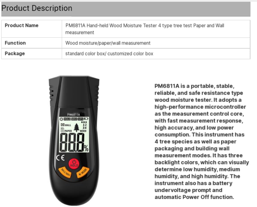 The PM6811A Digital Wood Moisture Meter is suitable for a wide range of applications where moisture content measurement is critical.