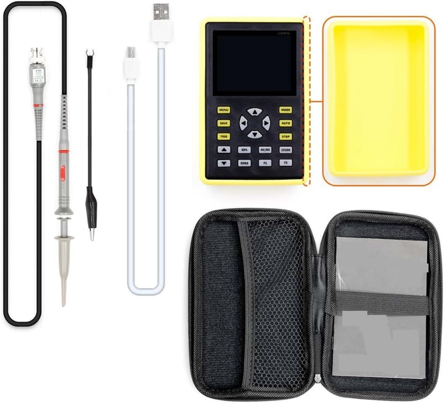 Figure 2.2.1: The ZHDBD 5012H Digital Oscilloscope package includes the main unit, a probe, a USB cable for charging and data transfer, and a protective carrying case.
